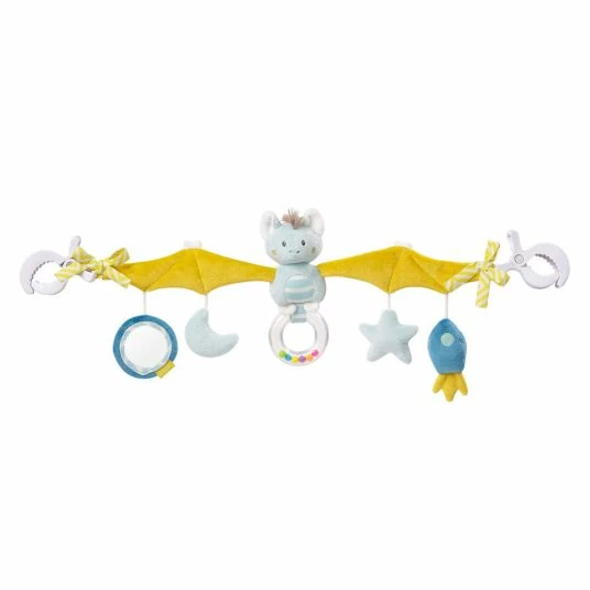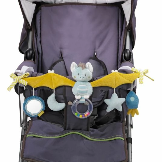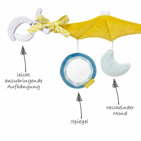 Mit der Kinderwagenkette Fledermaus aus der Little Castle Kollektion von Baby Fehn bleibt kein Sinn unberührt. Sie hält Dein Kleines zu jedem Ausflug bei Laune. Die niedliche Fledermaus regt mit ihren breiten Flügeln Babys Tastsinn an. Die Anhänger, die allesamt entdeckt, erforscht und erfühlt werden wollen, fördern das gezielte Greifen und die Hand-Auge-Koordination. Der tolle Rasselring ist leicht zu greifen, unterstützt mit bunten Perlen in Regenbogenfarben die natürliche Neugier Deines kleinen Schatzes und animiert zum Schütteln und Spielen. Dabei flitzen die bunten Perlen in ihrem Rohr lustig und schnell umher. Kleine Entdecker werden schnell verstehen, wie das funktioniert. Die rasselnde Rakete, der quietschende Stern und der raschelnde Mond ziehen mit Geräuschen Babys Aufmerksamkeit auf sich. Im kleinen Spiegel kann Dein Kleines spielerisch sich selbst entdecken. Die 2 Klemmen ermöglichen eine einfache und flexible Befestigung der Kinderwagenkette an Babyschale, Kinderwagen, Laufstall, Bettchen und mehr. So hilft sie Deinem Baby, zuhause und auch unterwegs spielerisch die Welt zu begreifen.