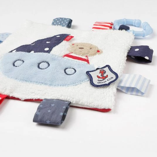 Lustiger Spielspaß ob Zuhause oder unterwegs: Mit dem praktischen Ring kann das Knistertuch Teddy aus der Ocean Club Kollektion von Baby Fehn an Kinderwagen, Babyschale oder Bett befestigt werden. Die verschiedenen Spielmöglichkeiten sorgen überall für gute Laune – Raschelpapier, Quietsche und die vielen Greifelemente regen die Neugier an und fördern Babys Greif- und Tastsinn sowie die Feinmotorik. Das geschmeidige Material aus Softvelours, Stoff, Plüsch sowie das niedliche Teddy Design sorgen für kuscheliges Spielen & Erkunden, damit wird das Knistertuch sicher zum treuen Begleiter ob Zuhause oder auf Reisen.