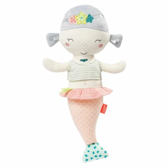 Flauschig weich, mit Applikationen bunten Details ausgestattet, bietet das hübsche Meermädchen verschiedene Möglichkeiten zum Tasten und Fühlen. In praktischer Form und mit vielen Greifmöglichkeiten versehen, lässt sich die niedliche Begleiterin überall mit hinnehmen und gut von kleinen Kinderhändchen halten. Wird die Spielgefährtin einmal schmutzig, kannst Du sie einfach in der Maschine reinigen.