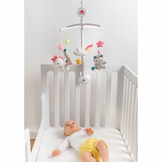 Das Musik-Mobile Aiko & Yuki von Baby Fehn wird Babyaugen zum Leuchten bringen: Die kleinen Einhörner und Katzen sorgen tagsüber für Spielspaß und sind abends treue Einschlafhelfer. Die knalligen Farben und interessanten Strukturen fesseln die Aufmerksamkeit des Babys und erwecken die Fantasie. Die beliebte Melodie Schlafe mein Prinzchen der mechanischen Spieluhr lässt die Figuren tanzen und regt das Baby zum Lauschen an: In ruhigen Minuten lässt sie sich dank des An/Aus-Schalters abstellen. Das Mobile wird ganz einfach am Babybett befestigt und ist damit ein süßer Hingucker im Kinderzimmer!