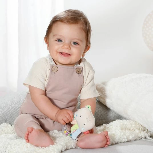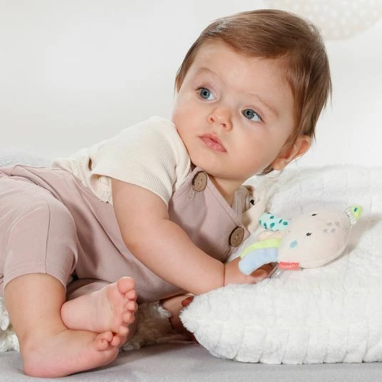 Der süße Oktopus lädt zum Greifen und Bewegen ein, während die Geräusche der Rassel und der Quietsche das Gehör des jungen Entdeckers schulen. Der Greifling lässt sich von kleinen Kinderhänden sehr gut halten und ist mit seiner praktischen Größe von 14 cm auch unterwegs eine tolle Beschäftigung für Dein Baby. Die weichen Stoffe liegen dabei sehr angenehm in der Hand, die bunten Füßchen animieren zum Tasten und Fühlen. Die niedliche Gestaltung macht das Spielzeug zu einer tollen Geschenkidee.
