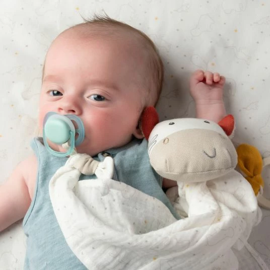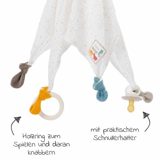 Das beliebte Deluxe-Schmusetuch Zebra aus der fehnNATUR® Kollektion ist Tröster, Wärmespender, Einschlafhelfer und Kuschelfreund in einem und dabei Babys treuer Begleiter zuhause und auf Reisen. Beim Einschlafen spendet das natürliche Kuschel-Zebra Geborgenheit. Tagsüber laden der Holzring und die nachhaltigen Materialien aus 100% Bio-Baumwolle aus kontrolliertem und zertifiziertem Anbau sowie die Füllung aus 100% bio-basierten PLA-Fasern aus nachwachsenden Rohstoffen zum Greifen, Fühlen und Knuddeln ein, sodass das niedliche Zebra bald nicht mehr aus der Hand gegeben wird. Der praktische Befestigungsring am Stoff-Zebra sorgt dafür, dass Babys Schnuller auf großen Abenteuern nicht verloren geht.