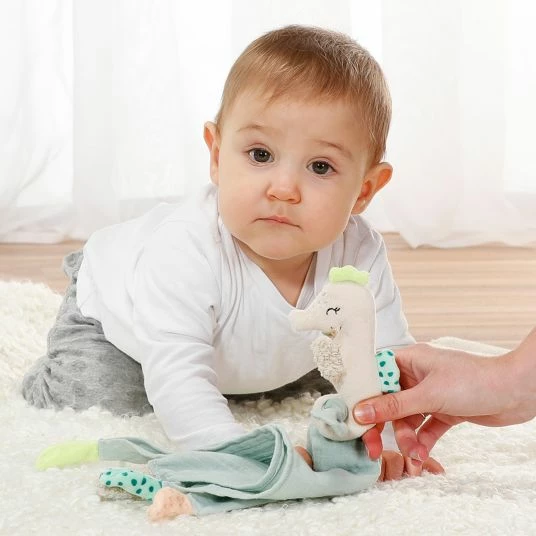 - regt zum Fühlen, Tasten & Greifen an mit flauschigen Details am Seepferdchen & am Tuch