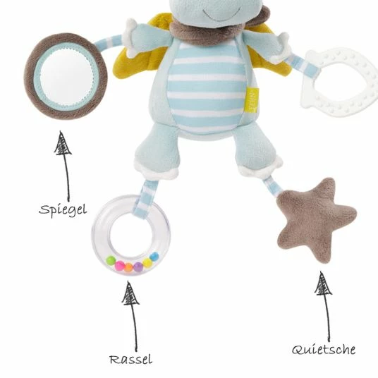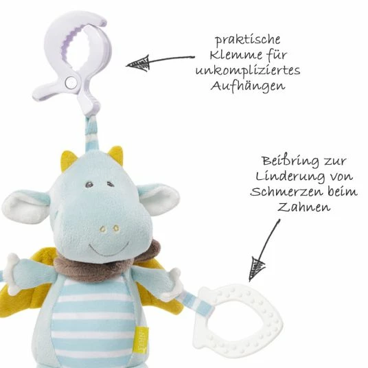 Der 38 cm große, kuschelweiche Spieltier-Drache zum Aufhängen aus der Little Castle Kollektion von Baby Fehn sorgt für gute Laune zuhause und unterwegs und ist bei jedem Abenteuer mit von der Partie. Abwechslungsreiche Materialien in schönen Blautönen laden zum Tasten und Fühlen ein. Der Softbeißer mit Noppenstruktur unterstützt Dein Kleines beim Zahnen und lindert den Schmerz. Die Ringrassel mit bunten Perlen und die verborgene Quietsche im Stern wecken mit Geräuschen Babys Neugier, fördern das gezielte Greifen und animieren zum Schütteln und Spielen. Der kleine Spiegel ist perfekt für das lustige Guck-Guck-Spiel. Wenn der Drache schaukelt, klingelt das Glöckchen hell und fröhlich in seinem Bauch. Mit der praktischen Klemme ist der Activity-Drache einfach und sicher an Babyschale, Kinderwagen, Laufgitter und Bettchen befestigt und wird so zum treuen Begleiter und absoluten Lieblingsspielzeug Deines kleinen Schatzes.