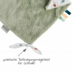 Besonders praktisch: An einem Ring lässt sich der Lieblingsschnuller Deines Babys befestigen und in einer kleinen Tasche verstauen. So geht er nicht mehr so leicht verloren. Wird das Tuch schmutzig, kannst Du es per Maschinenwäsche bei 40°C reinigen.
