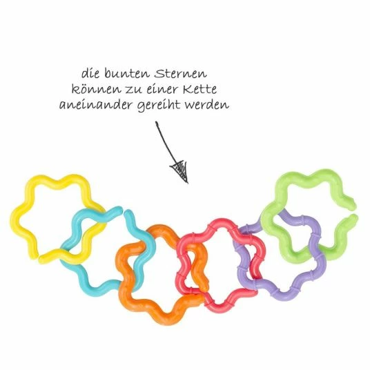 Der lustige Greifling bunte Sterne von Chicco ist ein toller Spielfreund für Ihr Baby. Der leichte Greifling ist mit sechs sternförmigen Ringen versehen, die fröhlich klappern, wenn Ihr Kind sie schüttelt. Unterschiedliche Strukturen darauf fördern gleichzeitig spielerisch den Tastsinn. Die einzelnen Sterne sind an den Seiten offen und können abgenommen werden – so lassen sie sich dann beispielsweise zu einer Kette aneinander reihen.