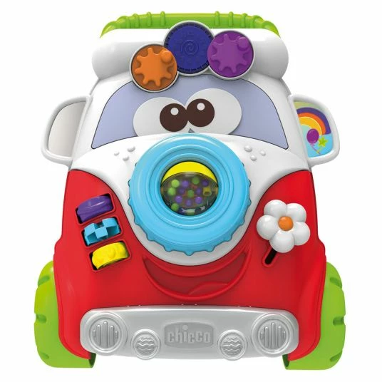 Die bunte Lauflernhilfe Bus von Chicco ist Spiel- und Bewegungsspaß zugleich. Am praktischen, grünen Haltegriff kann Dein Kind das Gefährt schieben und hat so eine Unterstützung; wenn es laufen lernt. Den Voderteil des Wagens bildet ein lustiges Gesicht mit allerlei Spiel-Elementen: Die Nase besteht aus einem Ball, der mit bunten Kugeln gefüllt ist und rasselnde Geräusche macht, wenn Dein Baby ihn bewegt. Ein Ohr der Lauflernhilfe ist mit einer Spiegelfläche beklebt, in der sich Dein Nachwuchs selbst betrachten kann. Auf der Stirn befinden sich drei Zahnräder; die ineinander greifen und sich drehen lassen. Und auf den Wangen gibt es eine bewegliche Blume sowie drei drehbare Räder. So machen das Laufenlernen und die Pausen zwischendurch gleich viel mehr Spaß.