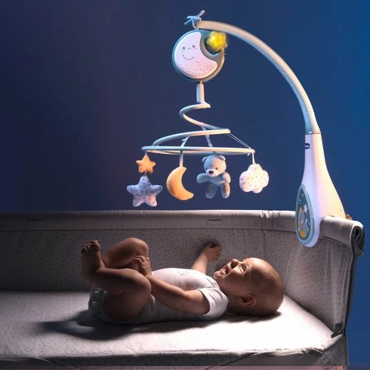 Das Musik-Mobile Next2Dreams von Chicco führt Dein Baby sanft ins Land der Träume. Es kombiniert unterschiedliche Einschlafmelodien mit einem sanften Nachtlicht. Außerdem tanzen 4 niedliche Stoff-Figuren über dem Bettchen Deines Kindes und begleiten es in den Schlaf.