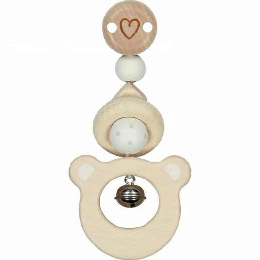 Die unterschiedlichen Größen und Formen der Holzelemente wollen von Deinem Schatz mit Fingern und Mund erforscht werden. Das macht nicht nur Spaß, sondern schult nebenbei auch die motorischen Fähigkeiten und die Sinne. Für das junge Gehör ist das kleine Glöckchen besonders interessant und motiviert zum Erkunden. Dank unbedenklicher Materialien darf der bezaubernde Clip bedenkenlos mit dem Mund erkundet werden.