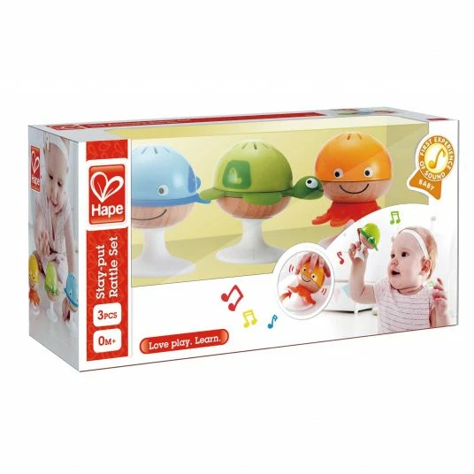 Das Saugnapf Rasselset von Hape garantiert langanhaltenden Spielspaß mit Schildkröte, Tintenfisch und Wal. Mit den bunten Farben und verschiedenen Tönen wird es nicht langweilig -jede Rassel macht beim Schütteln einen anderen Ton. Jede Rassel hat einen robusten Saugknopf, mit dem sie auf glatten Oberflächen gesichert wird, was das Umkippen des Spielzeugs verhindert. So wird Spielen zu jeder Zeit und an jedem Ort möglich. Das Set haftet fest auf allen glatten Oberflächen.
