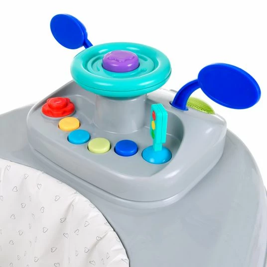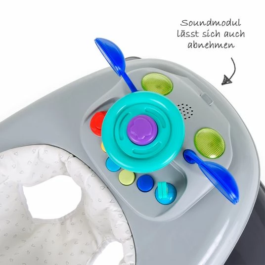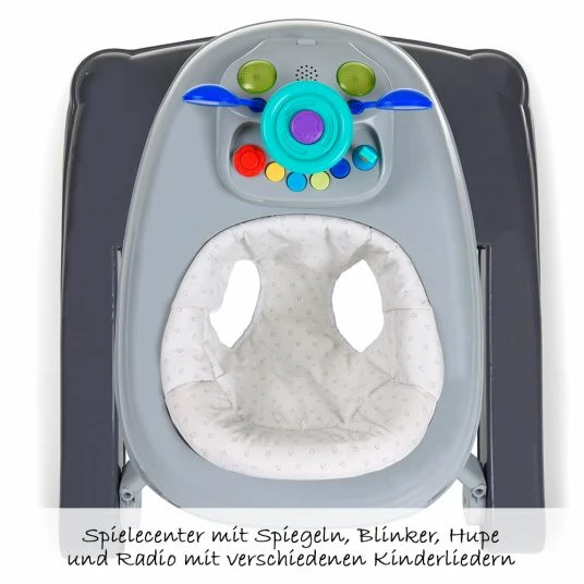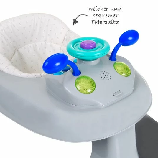Zuerst kann Dein Kleines ab 6 Monate die Lauflernhilfe als Spielecenter benutzen. Dazu ist Spielfläche dem Elterlichen Auto nachempfunden. Auf Dein Kleines wird es wirken wie das Cockpit von Deinem Auto mit seinen Armaturen und Spiegeln. Eine lustige Hupe ist natürlich mit dabei und am Lenkrad kann man sich schön festhalten. Auch die bunten Knöpfe und die funktionierenden Blinker wollen ausprobiert und gedrückt werden. Mal sehen was passiert. Entzückt wird Dein Kleines sein, wenn es das Radio einschaltet. Denn dann ertönt eine von vielen verschiedenen Kinderliedmelodien. Sollten die Melodien Dich ab und an mal stören, kannst Du das Musikmodul einfach abnehmen und Dein kleiner Schatz kann wortwörtlich ruhig weiterspielen. Der so frei gewordenen Platz kann dann für anderes Spielzeug oder das Servieren von Snacks genutzt werden.