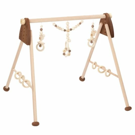 Mit dem Spiel-Trapez Baby Fit – Eichhörnchen von Heimess nature blüht Deinem Kleinen Schatz Unterhaltung der gehobenen Art, es gibt hier nämlich sehr viel zu entdecken. Seitlich hat es jeweils 3 dreh- und verschiebbare Ringe, die Dein Schatz liegend leicht mit den Händen erreichen kann. An der Stange über ihm baumeln 3 Greiflinge die bei Berührung lustig hin- und herschaukeln. Alle Spielzeuge können durch die vielen beweglichen Holzteile auch lustig klappern. So werden spielerisch die Sinne und Motorik Deines Kindes angeregt, sowie Stück für Stück trainiert. Das BabyGym lässt sich 6-fach in der Höhe verstellen und wächst mit Deinem kleinen Schatz mit. Egal ob im Liegen oder Sitzen – die Kleinen sprudeln vor Freude wenn sie verstehen wie man Bewegung und Klänge selbst erzeugt.
