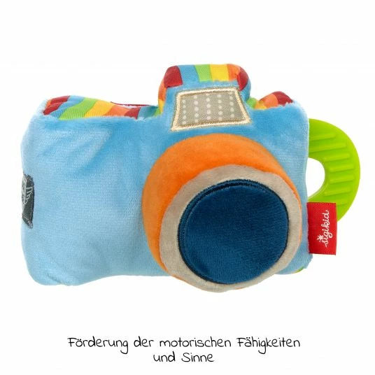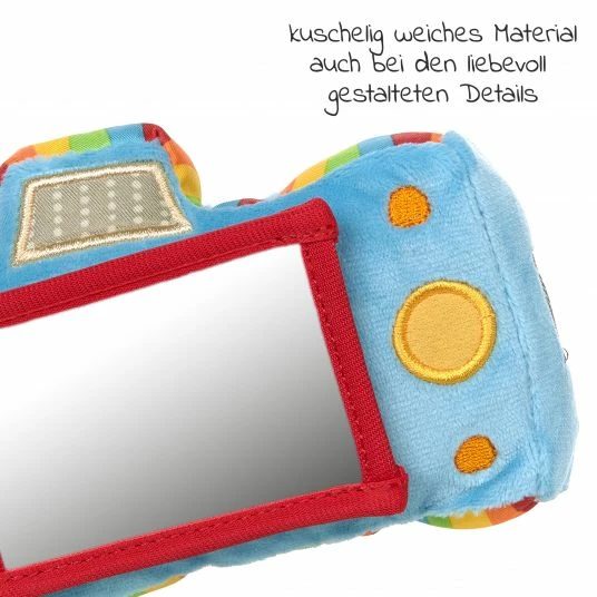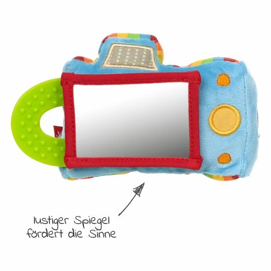 Der kunterbunte Fotoapparat lässt sich durch seine Form sehr gut von Babyhändchen festhalten und greifen. Er enthält einen Spiegel, in dem sich Dein Spatz selbst entdecken kann. Schmerzendes Zahnfleisch kann durch das Beißen auf dem Beißring beruhigt werden. Die Klänge der integrierten Rassel und der Quietsche bereiten Deinem Weltentdecker besonders viel Freude und schulen das Gehör. Für die kleinen Babyhändchen liegt der Apparat mit flauschig weichen Stoffen besonders angenehm in der Hand.