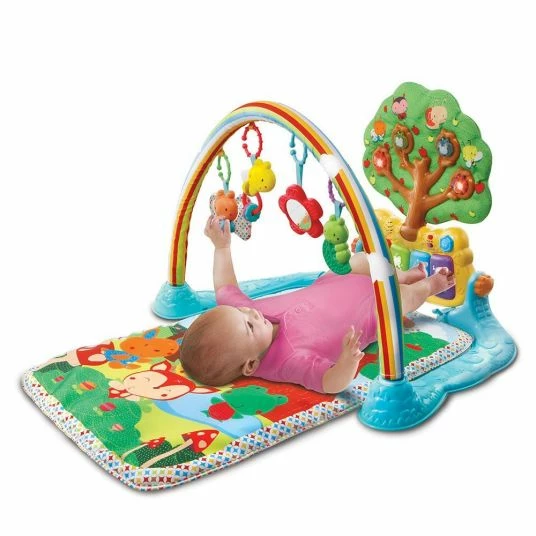 Die Musik-Spieldecke von Vtech ist ein wahrer Unterhaltungskünstler für Dein Baby. Die Unterlage ist nicht nur flauschig weich, sie hat auch einen süßen Aufdruck der an Wald und Wiese erinnert. Legst Du Deinen kleinen Schatz hin, sieht es über sich am Spielebogen viele bunte Spielelemente tanzen. Es kann dann danach greifen und die verschiedenen Oberflächen ertasten. Du kannst sie aber auch abnehmen damit Dein Schatz mit Schmetterling, Biene, Raupe und Spiegel auch einzeln spielen kann. Der musikspielende Baum hat aufblinkende Äpfel und kann 6 gesungene Lieder und 20 Kindermelodien spielen. Zum Mitsingen findest Du die Texte in der Bedienungsanleitung. Der Baum hat außerdem noch bunte Tasten die aufblinken und so zum Drücken einladen. Das Batteriefach ist kindersicher.
