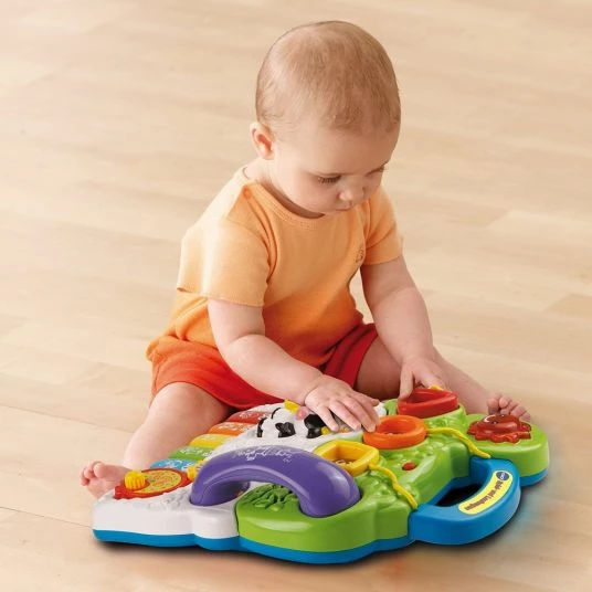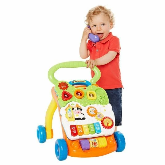 Der Spiel- und Lauflernwagen in Orange von Vtech hält jede Menge Überraschungen und Spielspaß für Ihren Nachwuchs bereit. Ihr Kind kann zum Einen das Laufen und Stehen trainieren, indem es den Wagen als praktische Stütze nutzt und zum Anderen gilt es, die lustigen Spiel-Funktionen zu entdecken. Da gibt es leuchtende Formen zum Aufstecken, bunte Musik-Tasten, drehbare Rollen und Zahnräder. Außerdem einen abnehmbaren Telefonhörer und eine witzige Kuh-Taste. Der Wagen ist mit einem Bewegungssensor ausgestattet und die Rollen sind in zwei Stufen in Ihrer Geschwindigkeit regulierbar. Er verfügt über ein gesungenes Lied, sowie eine Auswahl von elf Kinderliedern. Die entsprechenden Liedtexte finden Sie in der Bedienungsanleitung.